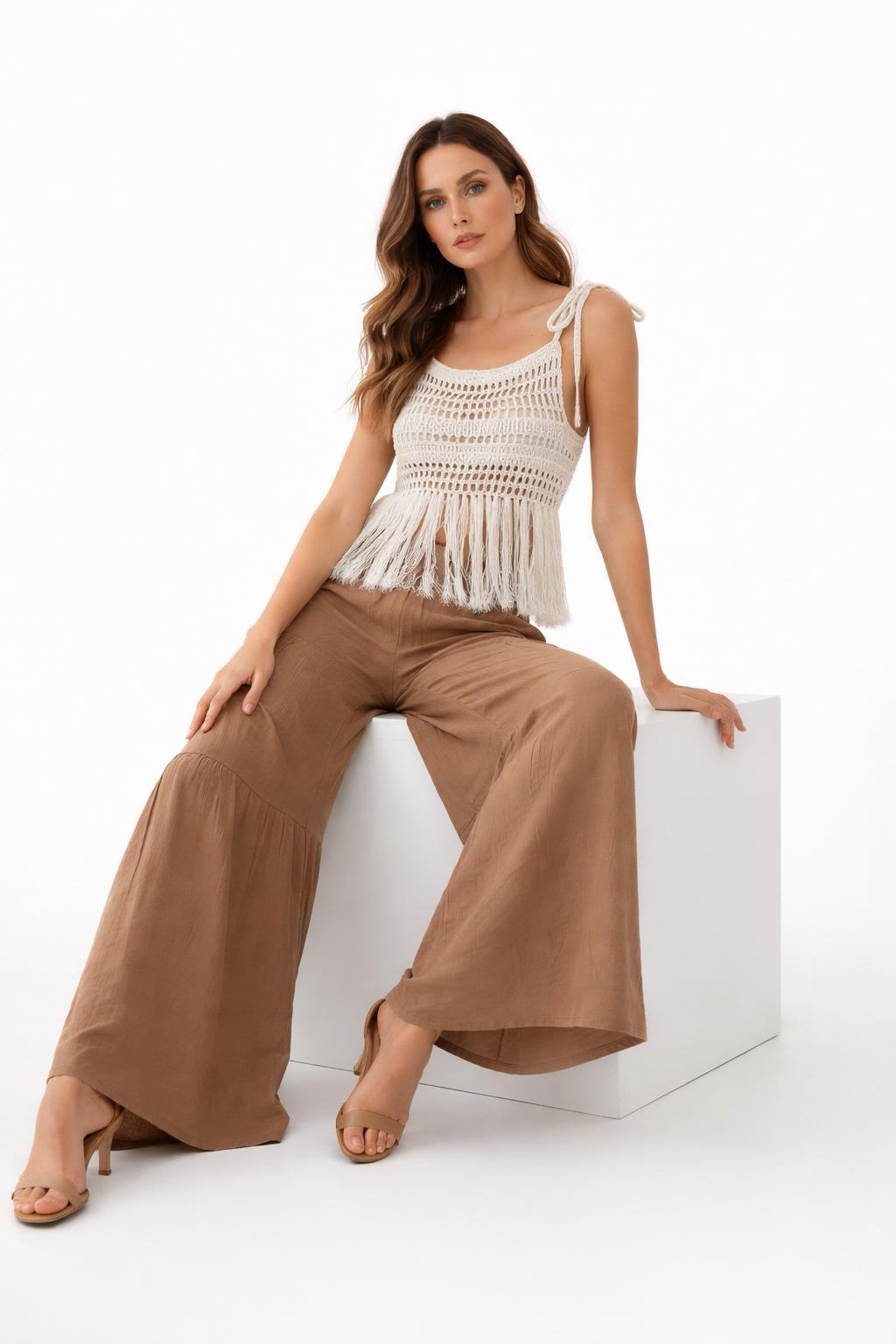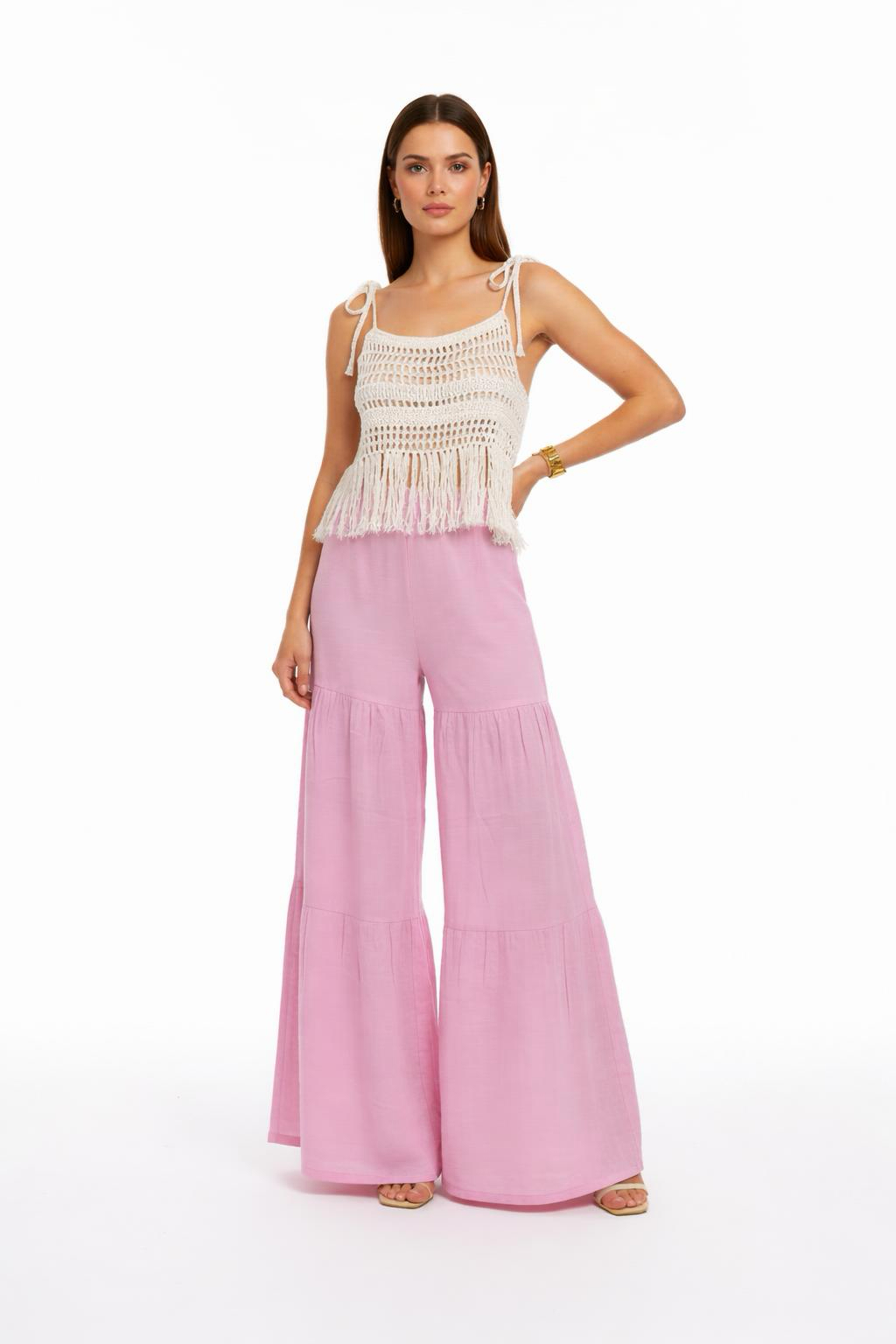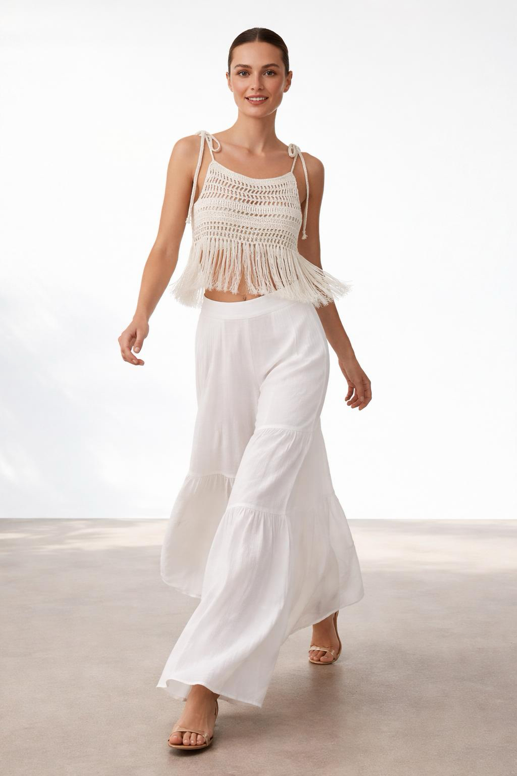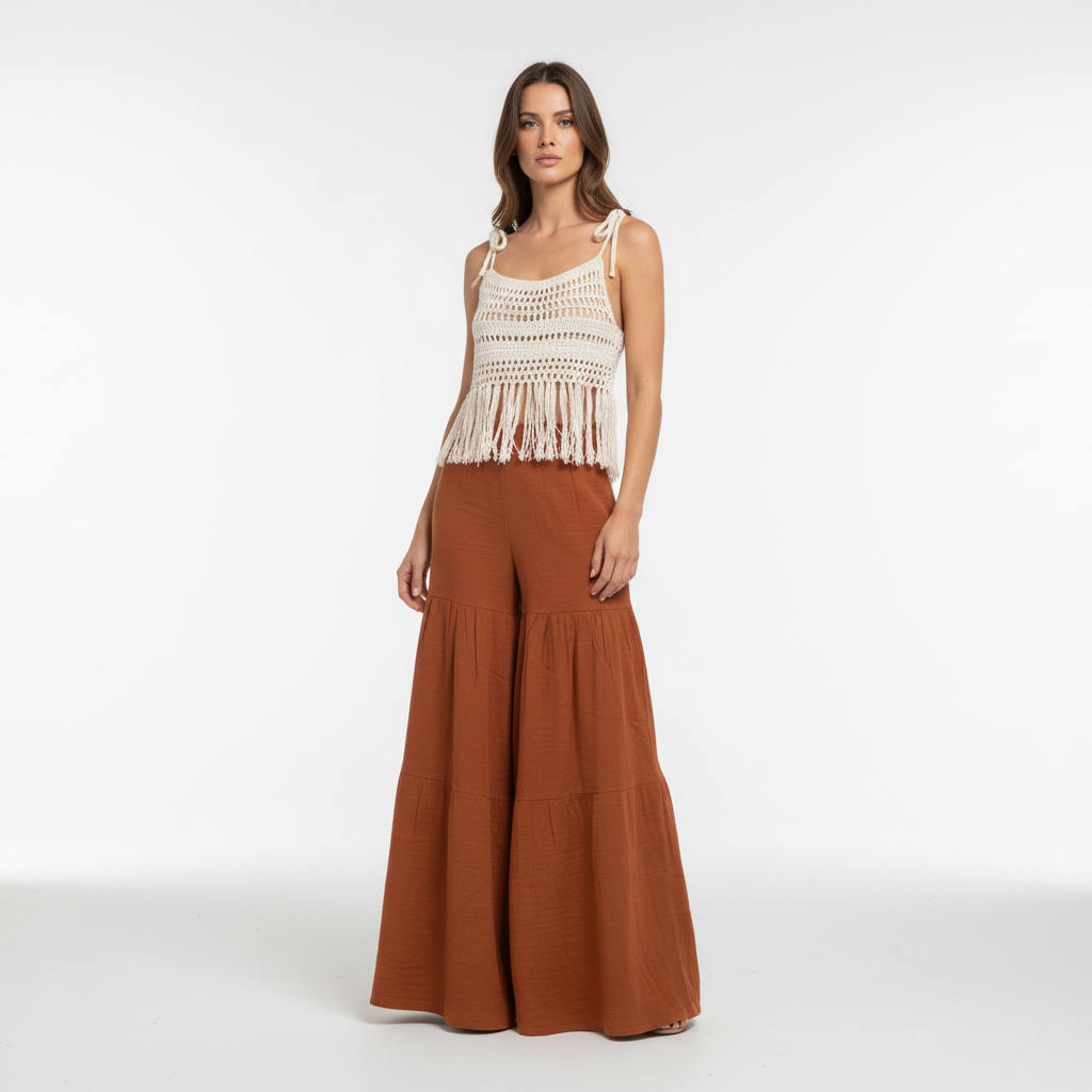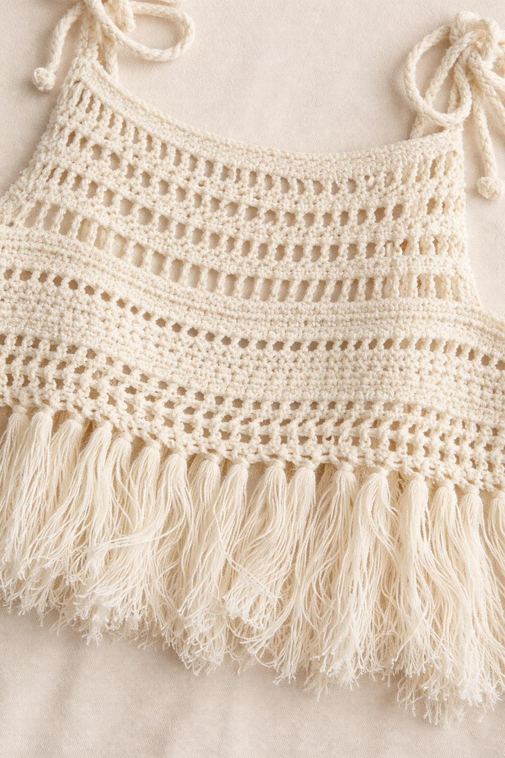 - Bluz: Ayarlanabilir ip askılı, örme dantel, koton örgü ve püskül detaylı.