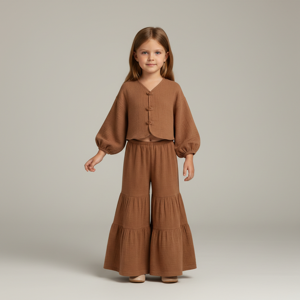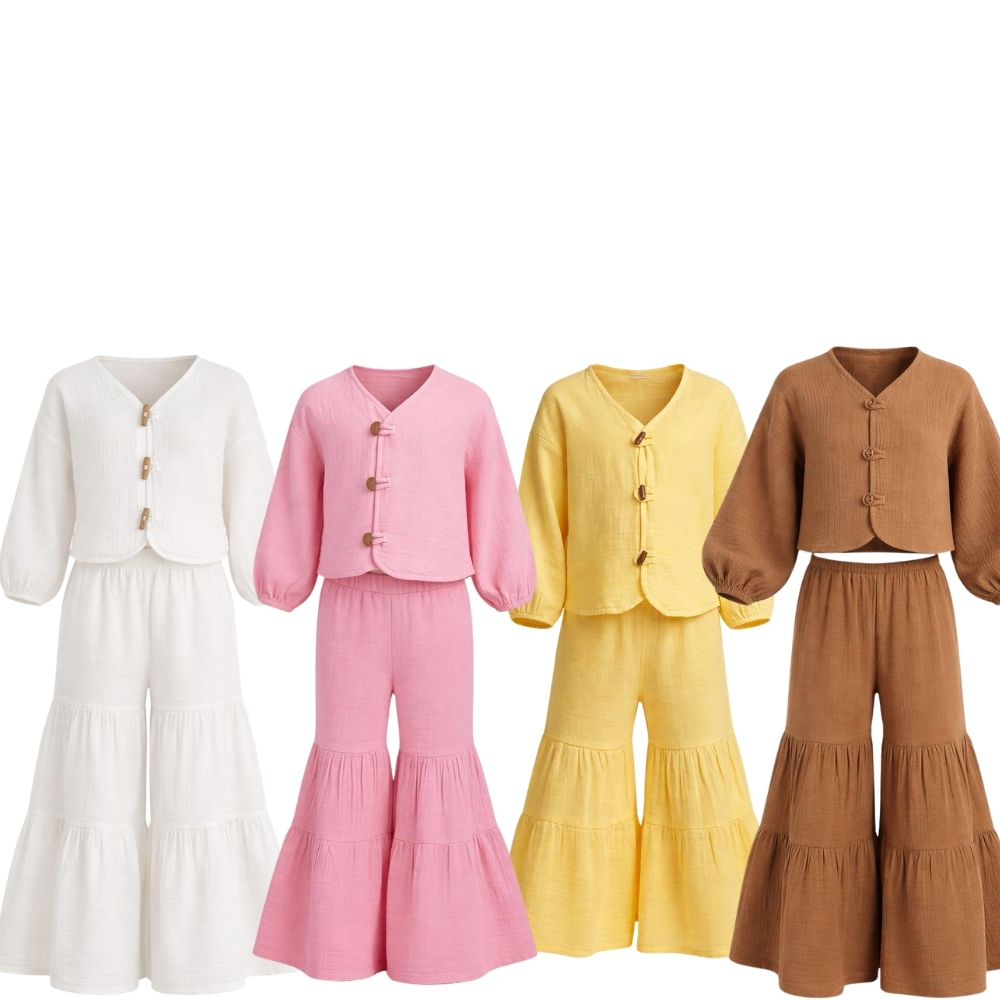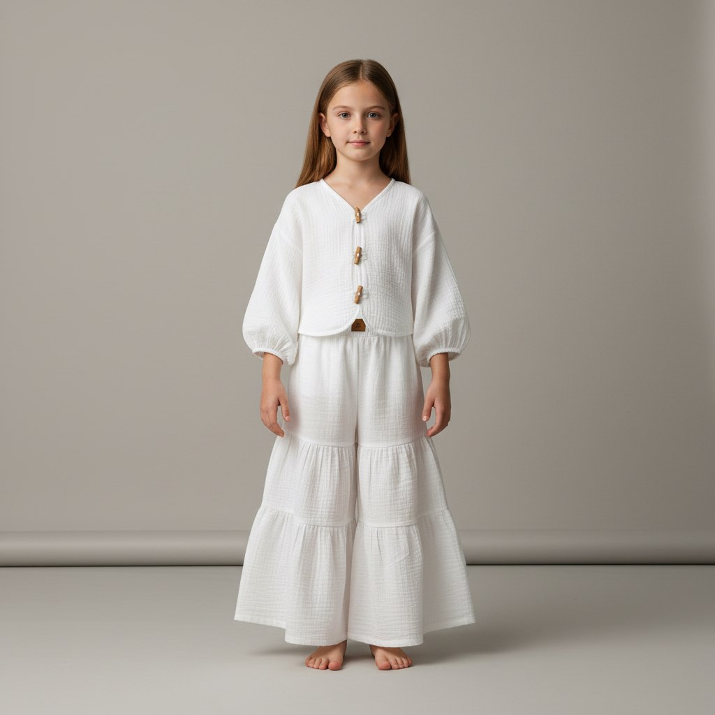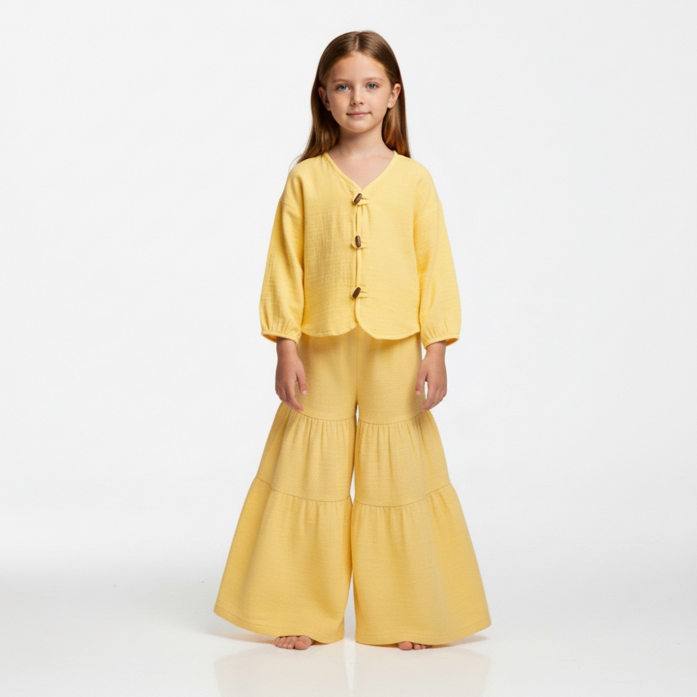 Kız Çocuk Balon Kollu İri Düğmeli Müslin Gömlek ve Pile Detaylı Müslin Pantolon Takımı