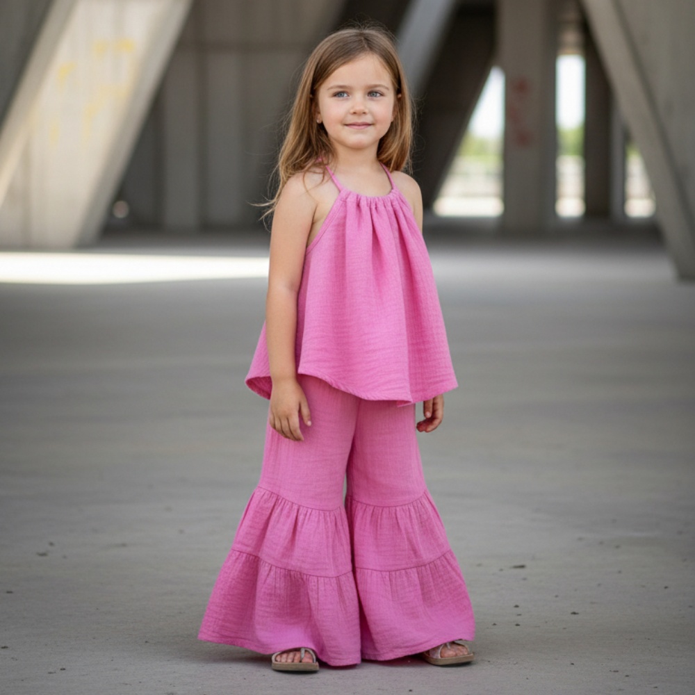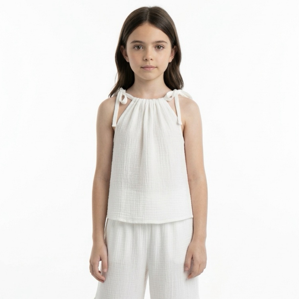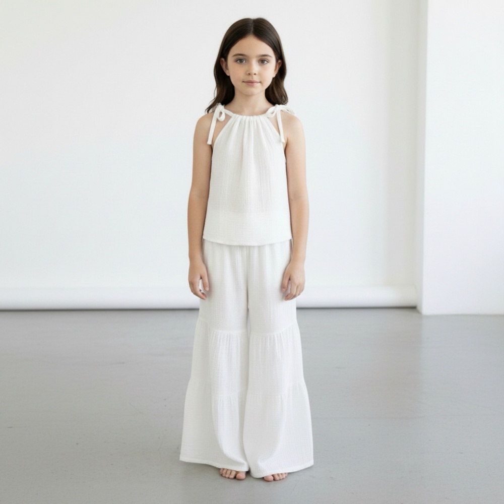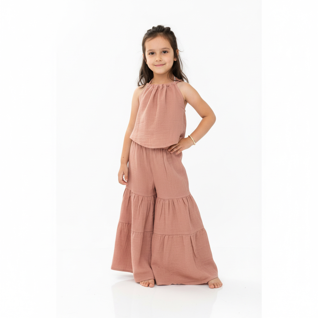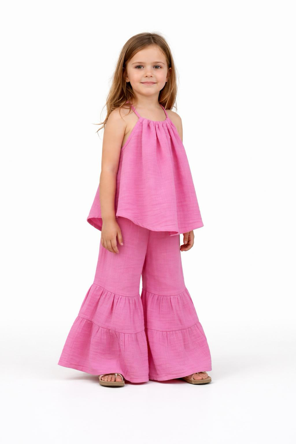 Kız Çocuk İp Askılı Müslin Bluz ve Pile Detaylı Müslin Pantolon Takımı