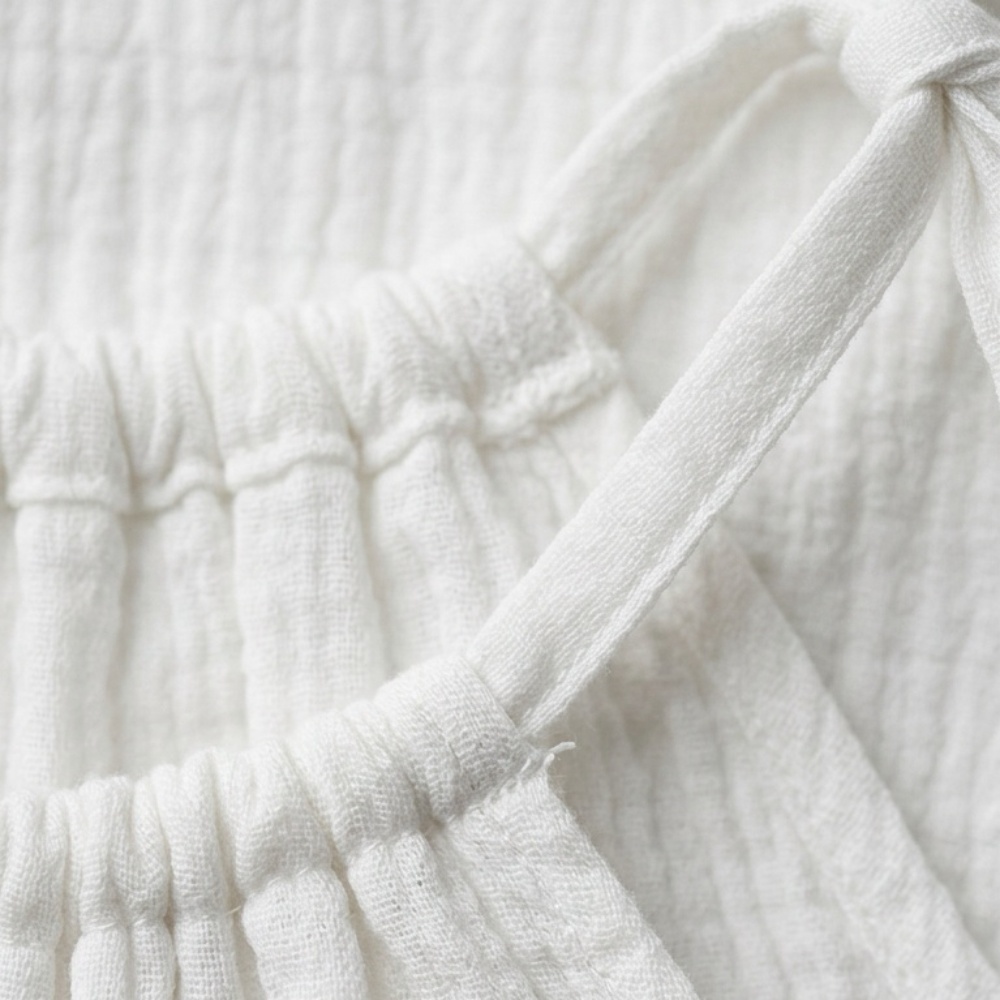 Müslin kumaşlar kırışmaya meyillidir ve bu kırışıklık kumaşın estetik dokusunun bir parçasıdır. Bu yüzden her ürün benzersizdir ve doğal formunda kullanılabilir.