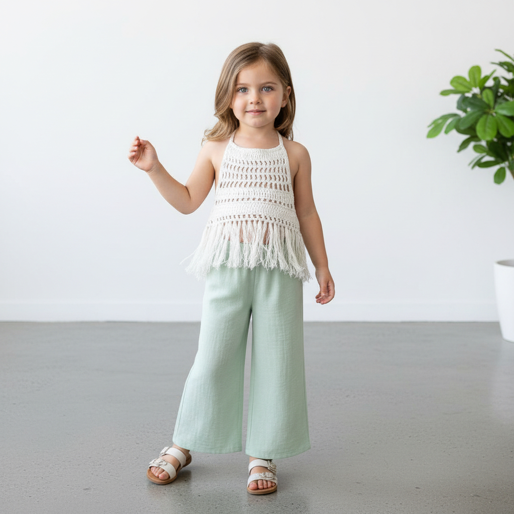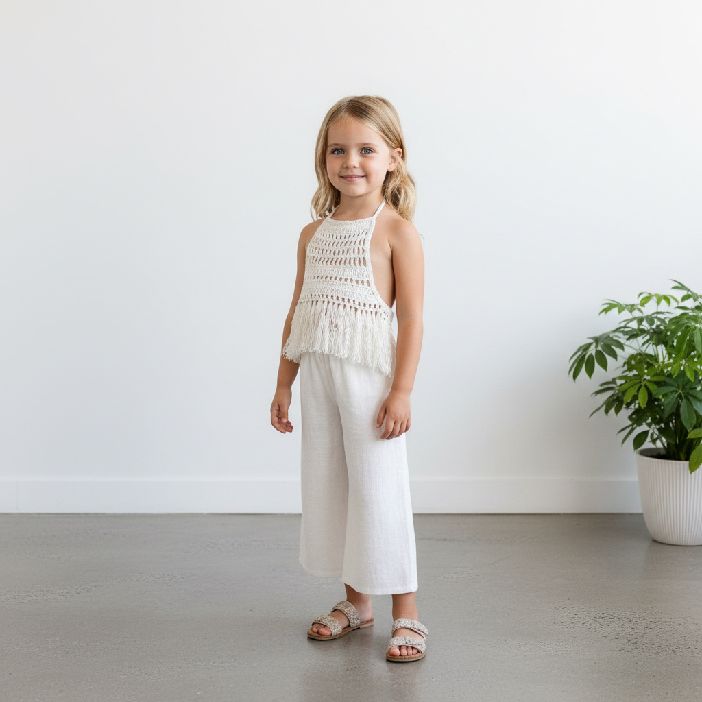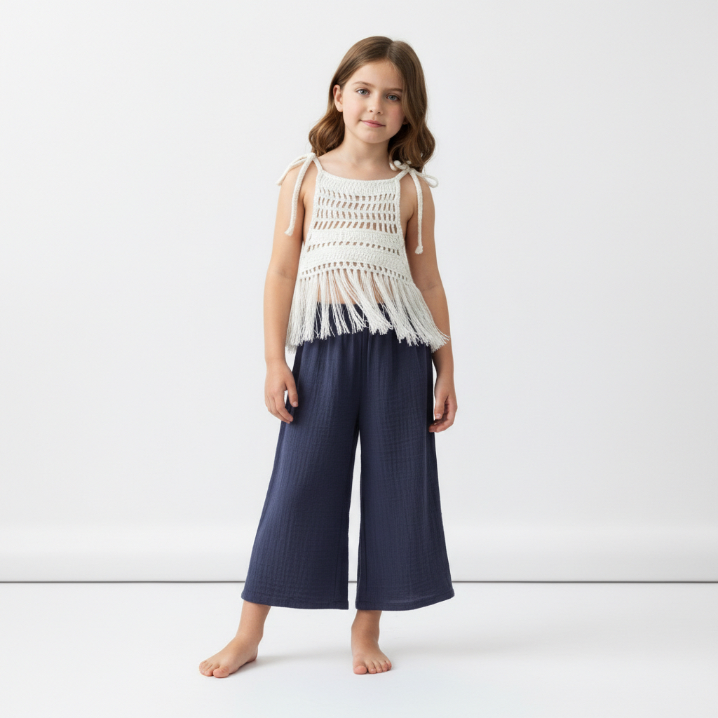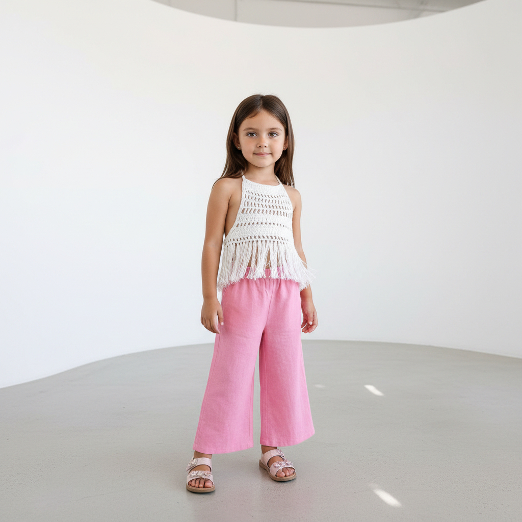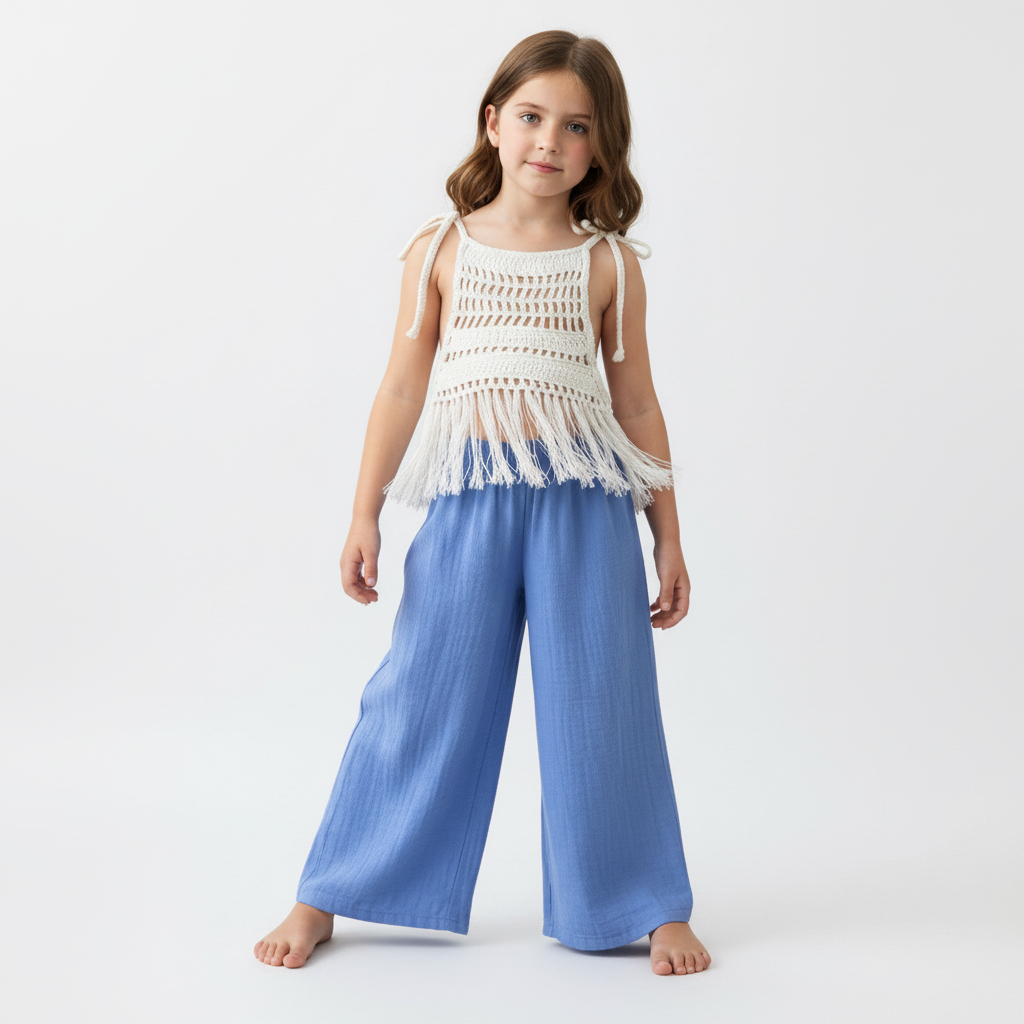 Tinnydoo’nun doğallığı ve konforu öne çıkaran yaz koleksiyonundan özel bir takım: Zarif dantel dokusu ve püskül detayıyla öne çıkan beyaz bluz, bol kesimli palazzo müslin pantolonla tamamlanıyor. Bu takım, minik hanımlar için hem şıklığı hem de rahatlığı bir arada sunuyor.