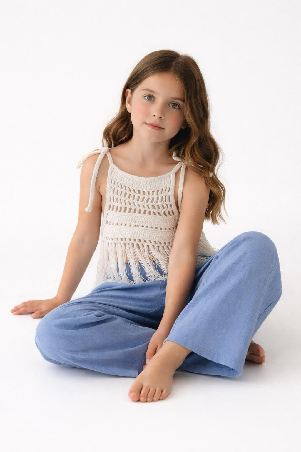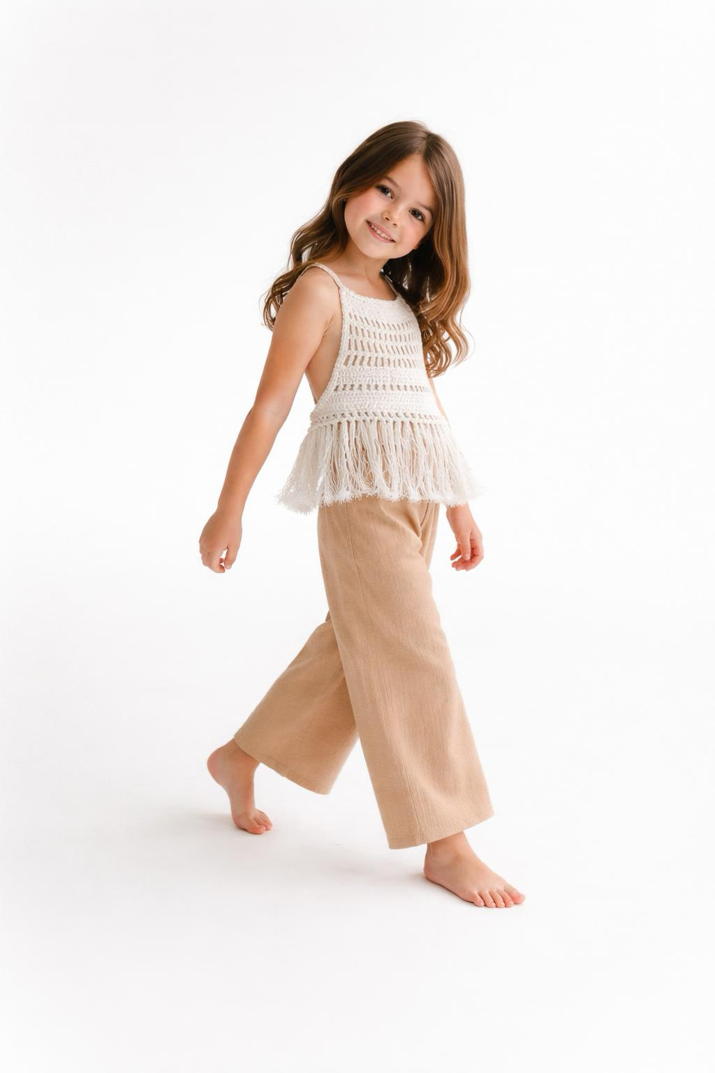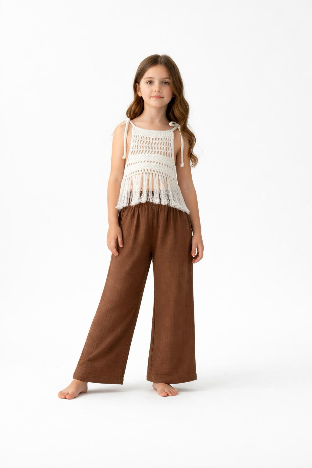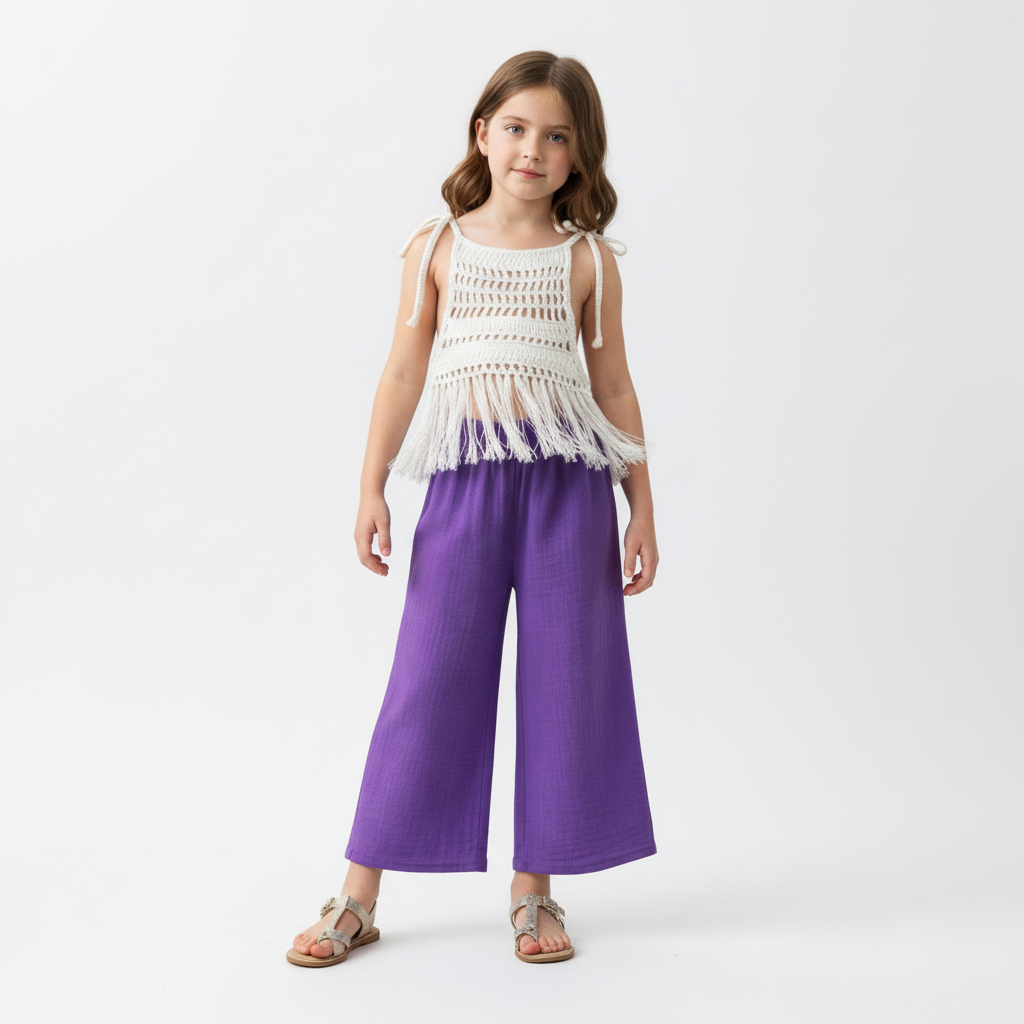 Tinnydoo’nun doğallığı ve konforu öne çıkaran yaz koleksiyonundan özel bir takım: Zarif dantel dokusu ve püskül detayıyla öne çıkan beyaz bluz, bol kesimli palazzo müslin pantolonla tamamlanıyor. Bu takım, minik hanımlar için hem şıklığı hem de rahatlığı bir arada sunuyor.