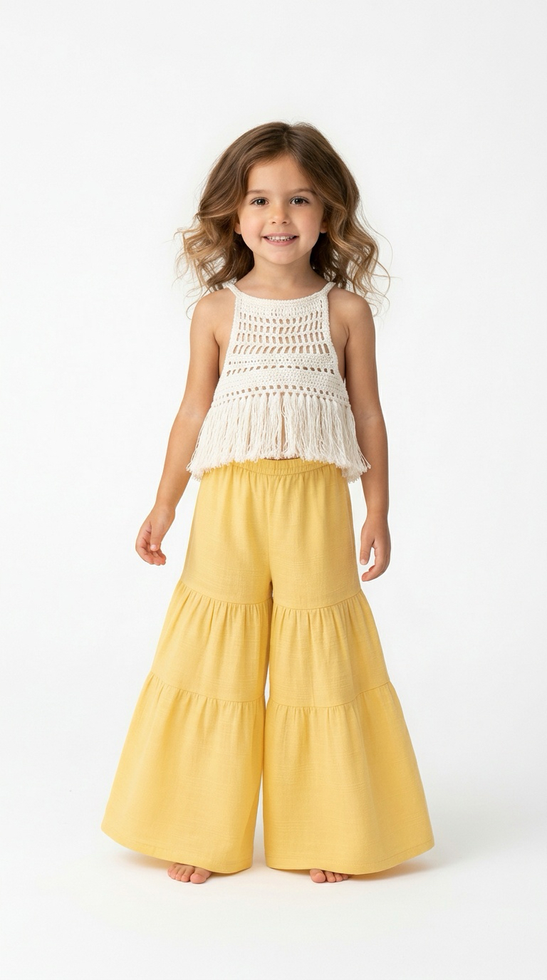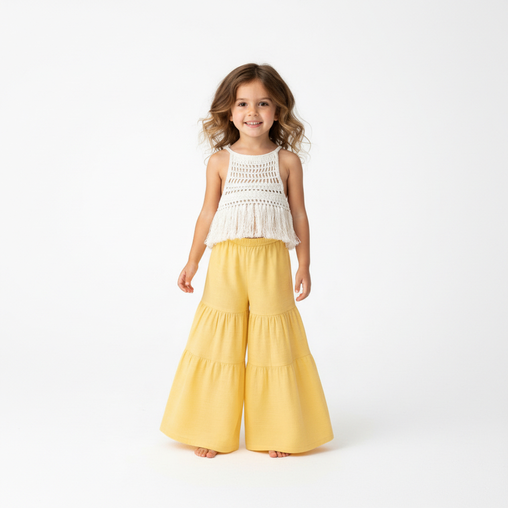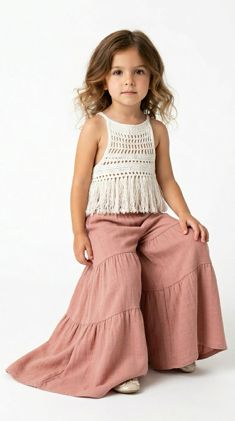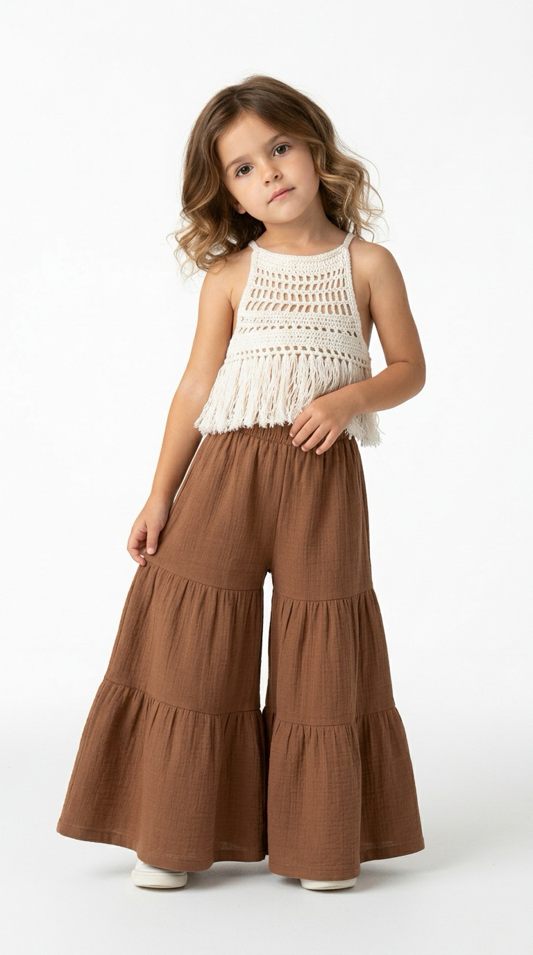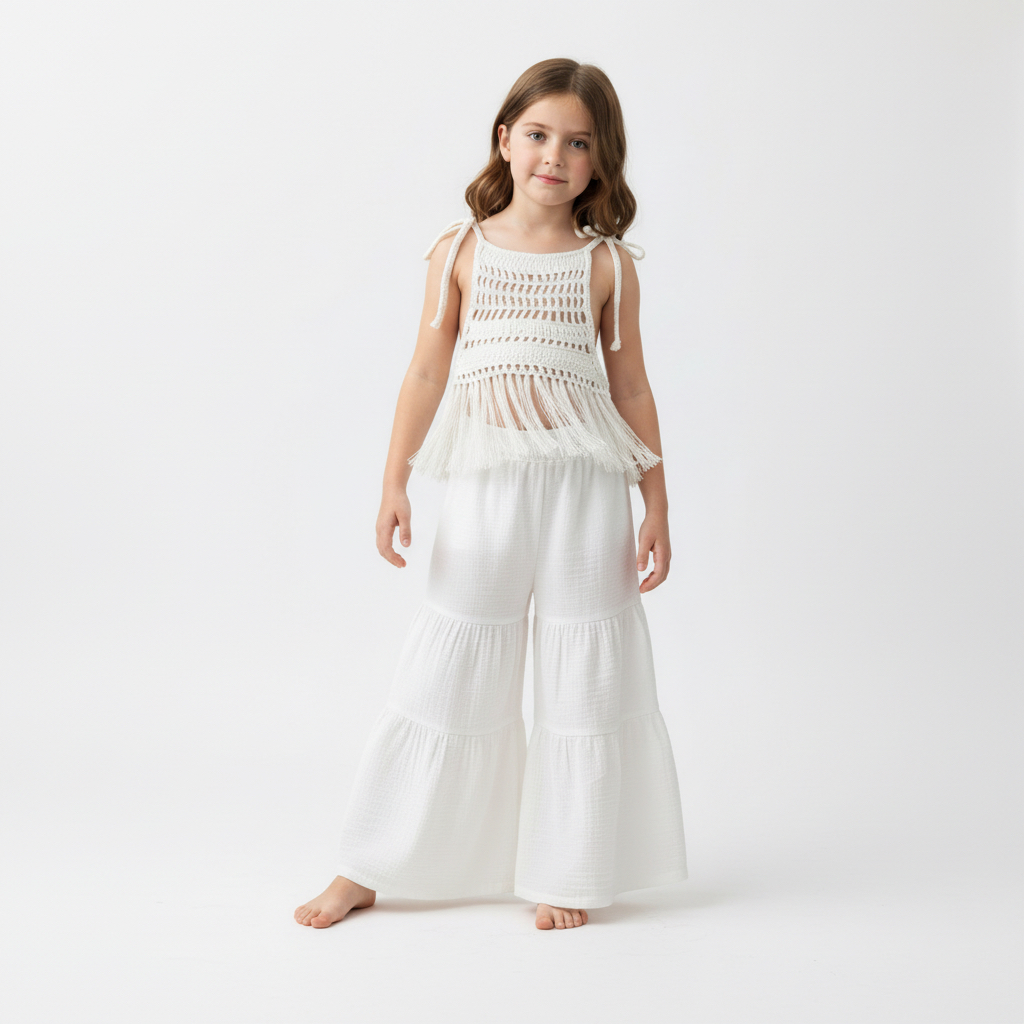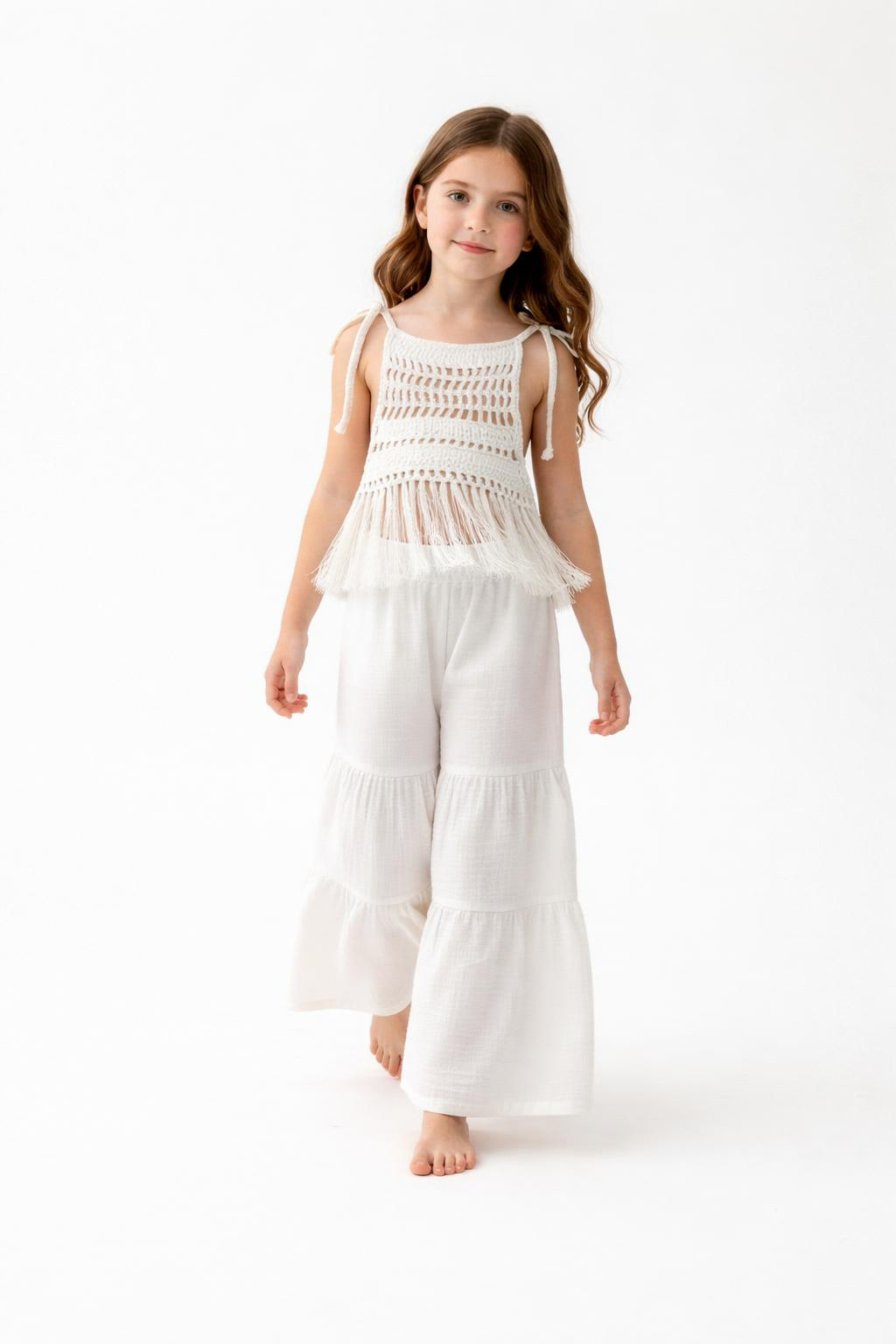 Tinnydoo’nun özel yaz koleksiyonundan zarif bir kombin: Püskül detaylı koton dantel bluz ve pileli, dökümlü müslin pantolonla buluşuyor. Bohem ve sade çizgileri bir araya getiren bu takım, hem özel günlerde hem de günlük kullanımda stil sahibi miniklerin tercihi olacak.