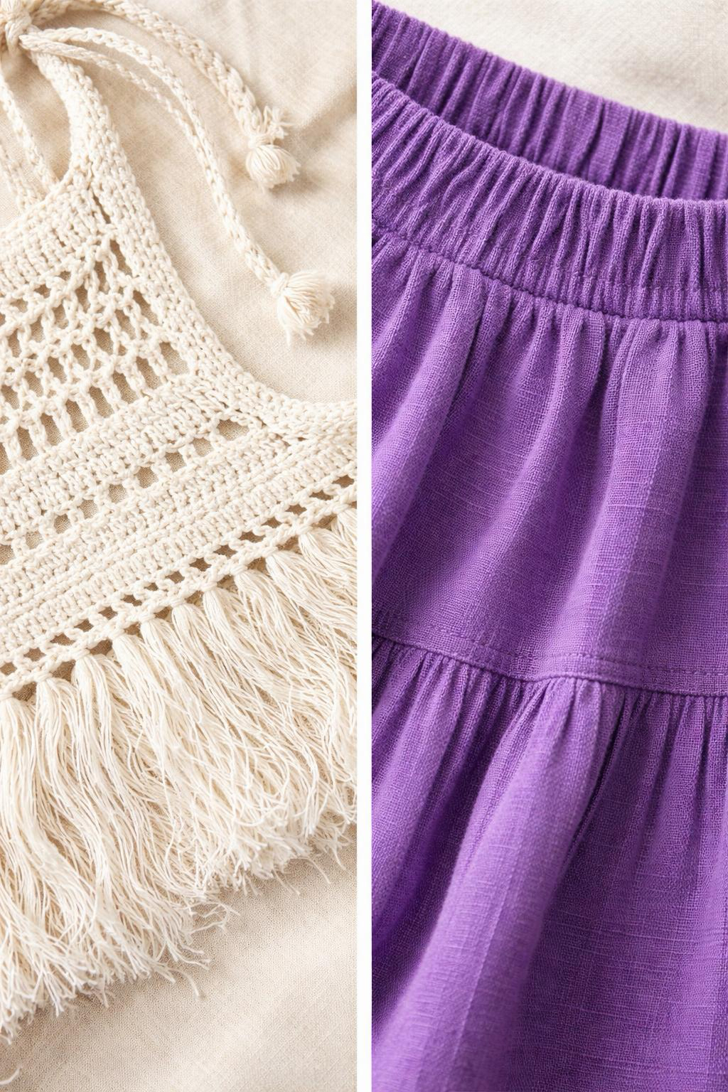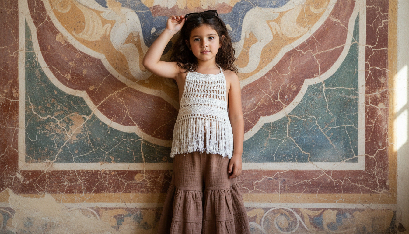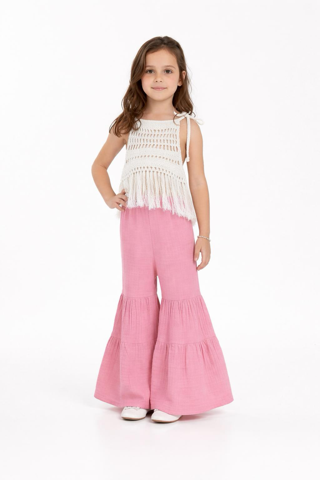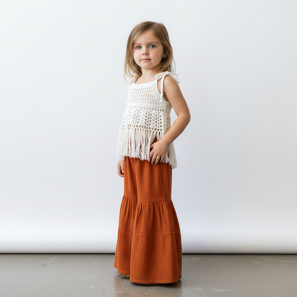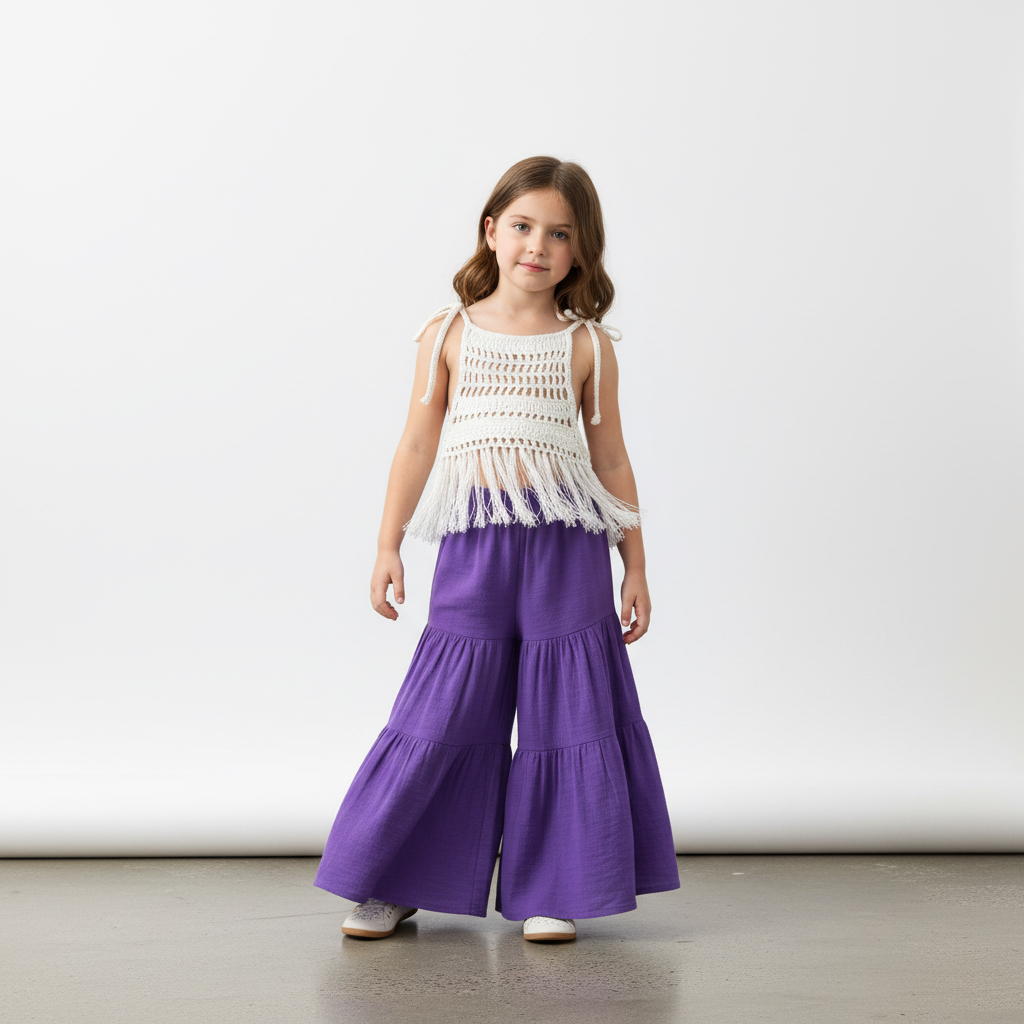 Tinnydoo’nun özel yaz koleksiyonundan zarif bir kombin: Püskül detaylı koton dantel bluz ve pileli, dökümlü müslin pantolonla buluşuyor. Bohem ve sade çizgileri bir araya getiren bu takım, hem özel günlerde hem de günlük kullanımda stil sahibi miniklerin tercihi olacak.