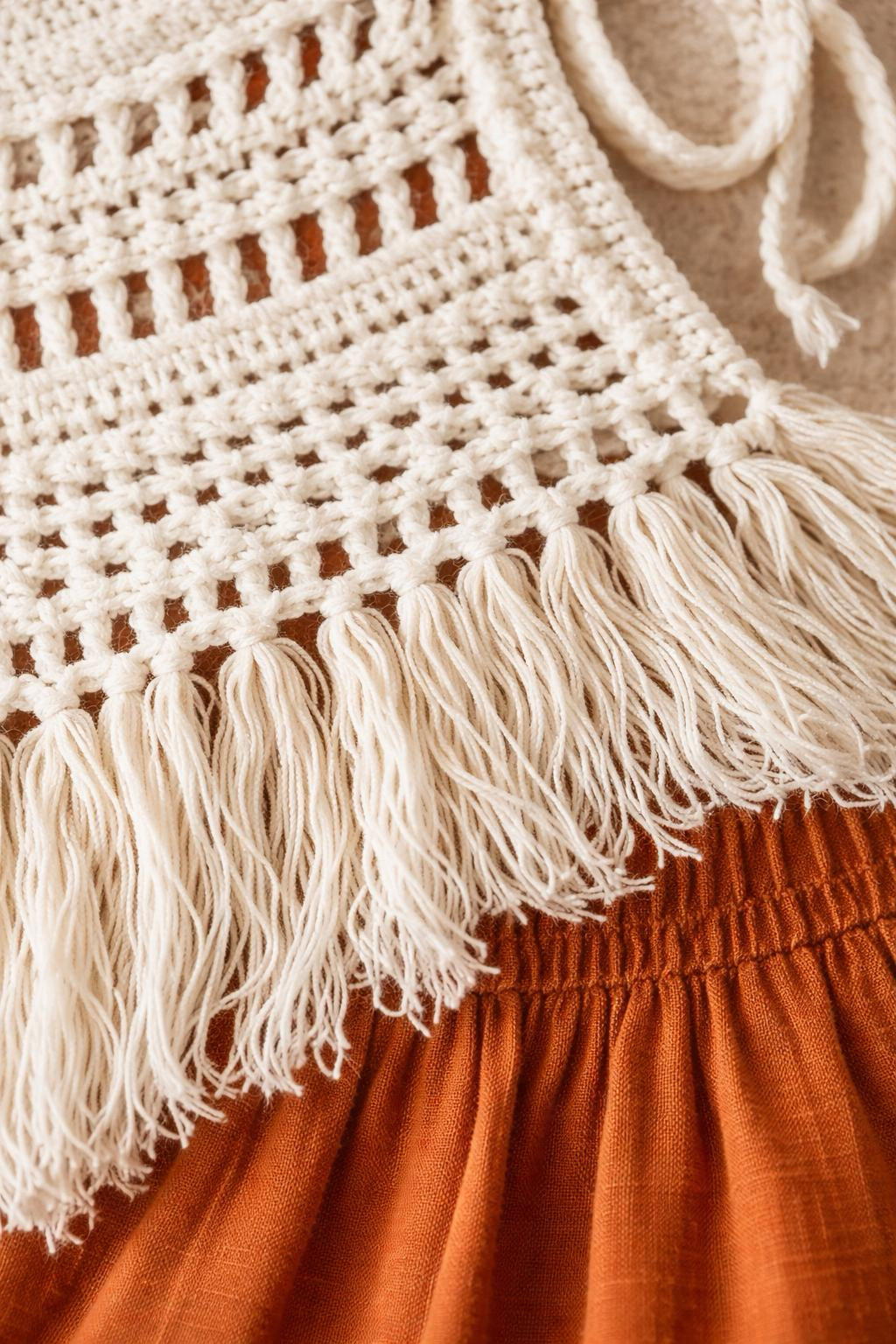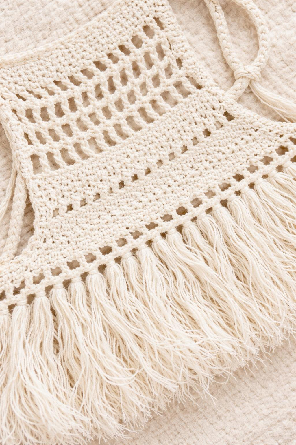- Bluz: Ayarlanabilir ip askılarla desteklenmiş bu örme dantel model, püskülleriyle hareketli ve dikkat çekici bir görünüm sunar. Hafif, nefes alan yapısıyla sıcak havalarda idealdir.