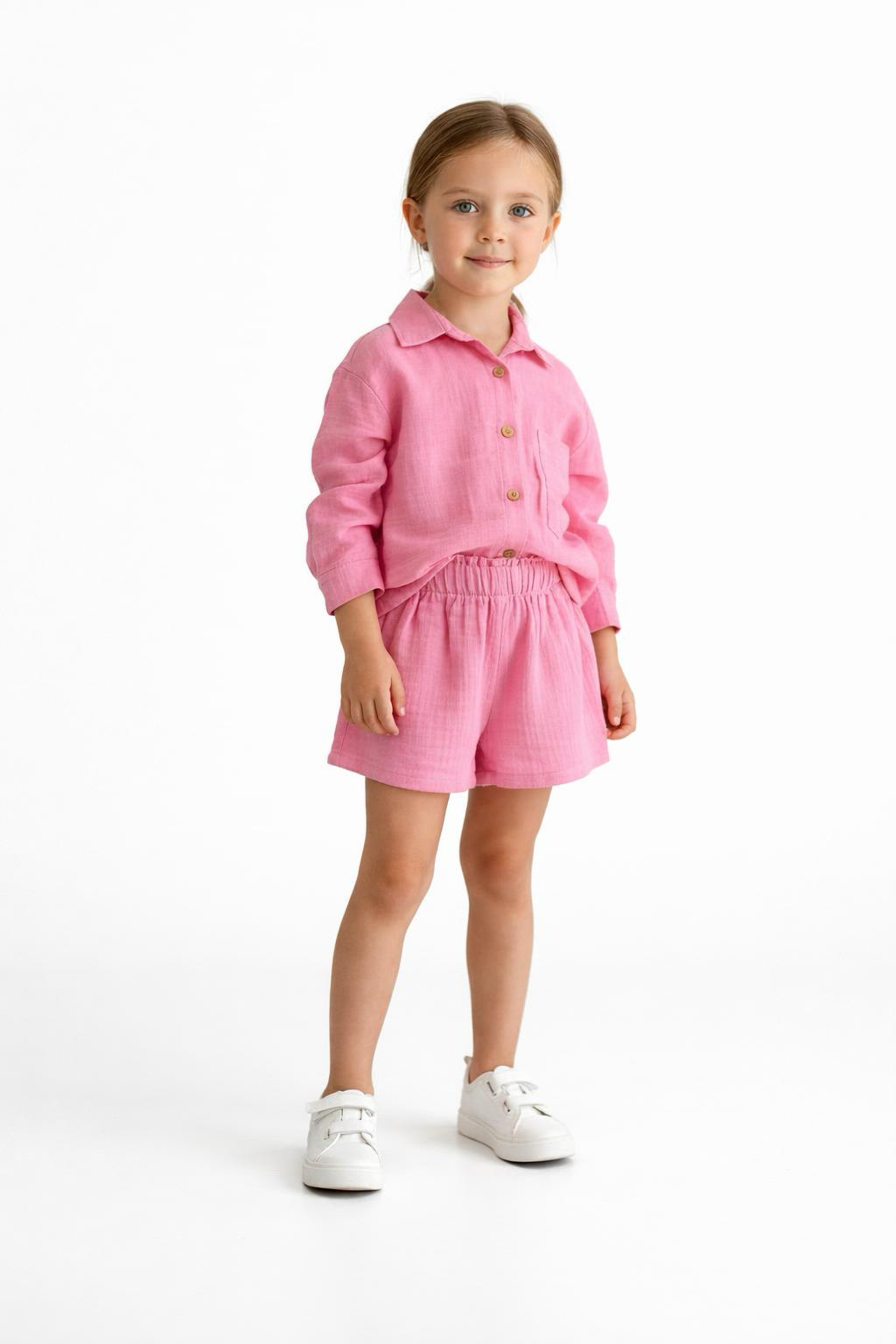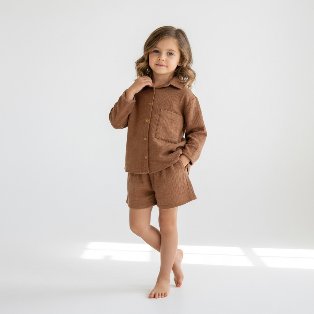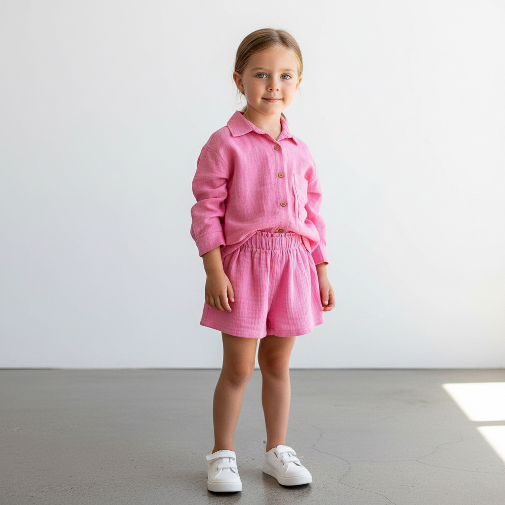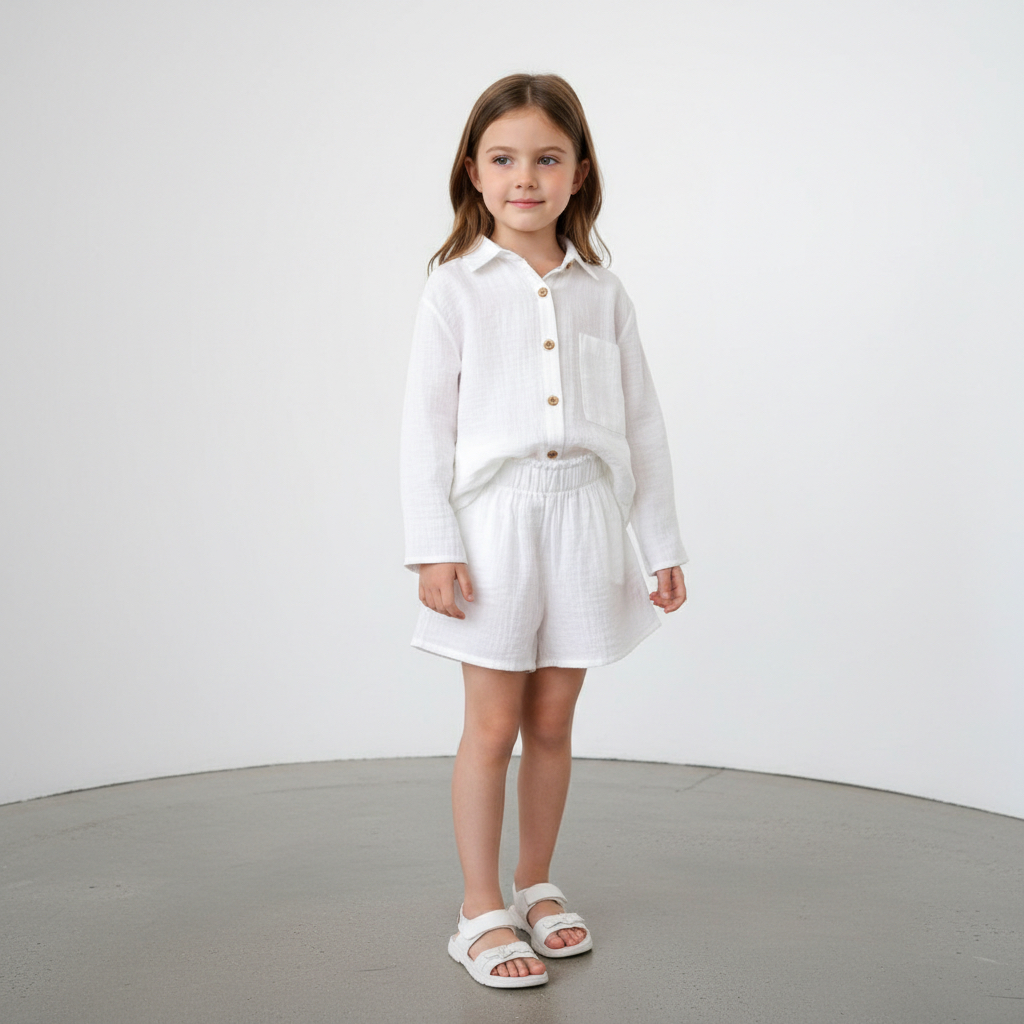Tinnydoo’nun yaz sezonuna özel hazırladığı bu takım; dökümlü salaş gömlek ile pamuklu müslin şortun uyumunu sunar. Gerek evde gerek dışarıda ferah ve şık bir görünüm için idealdir. Çocukların konforu ve tarzı düşünülerek tasarlanmıştır.