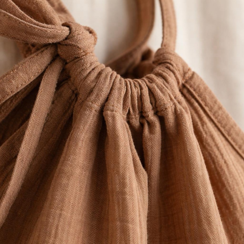 Müslin kumaşlar kırışmaya meyillidir ve bu kırışıklık kumaşın estetik dokusunun bir parçasıdır. Bu yüzden her ürün benzersizdir ve doğal formunda kullanılabilir.
