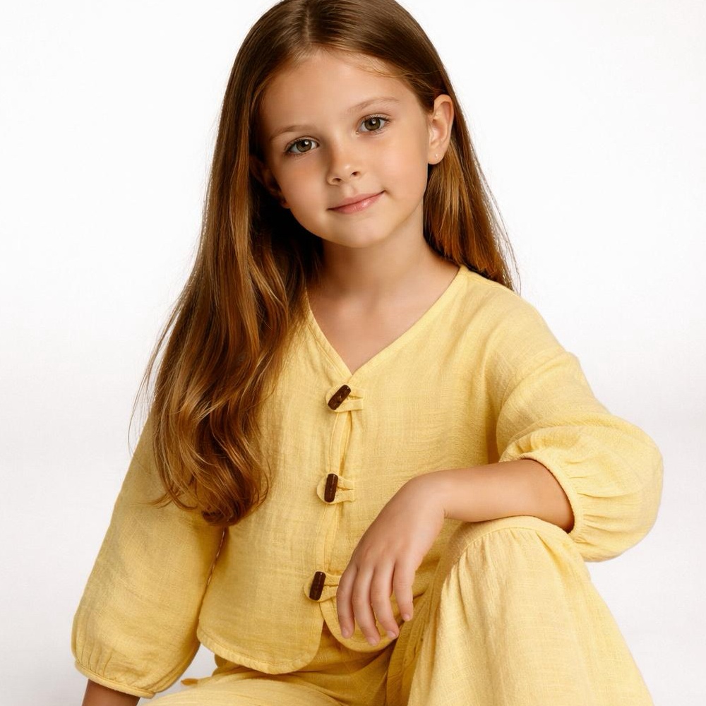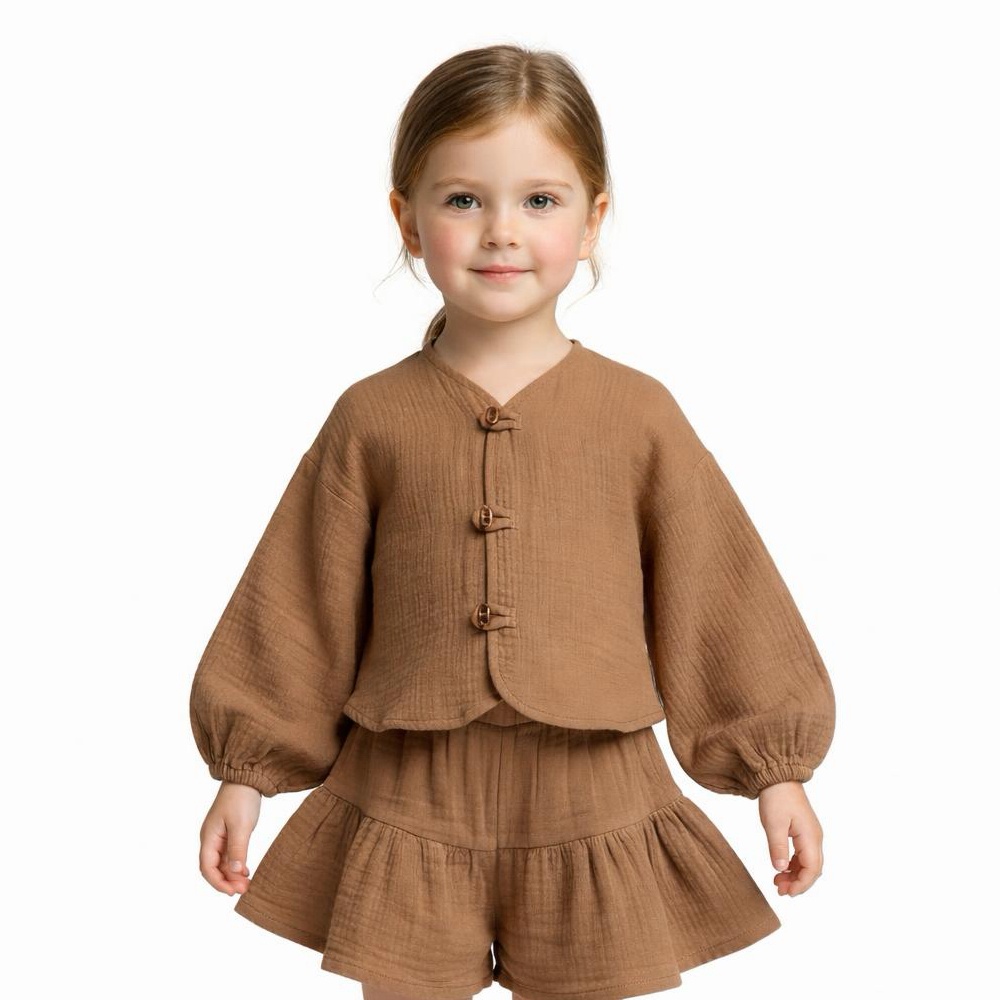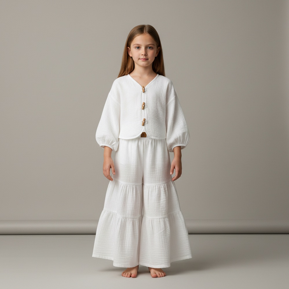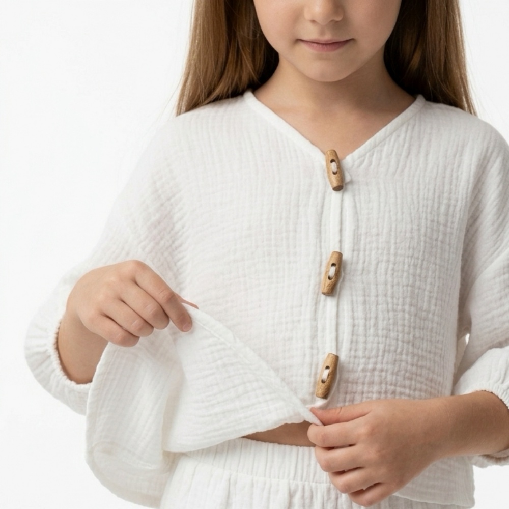 Kız Çocuk Balon Kollu İri Düğmeli Müslin Gömlek
