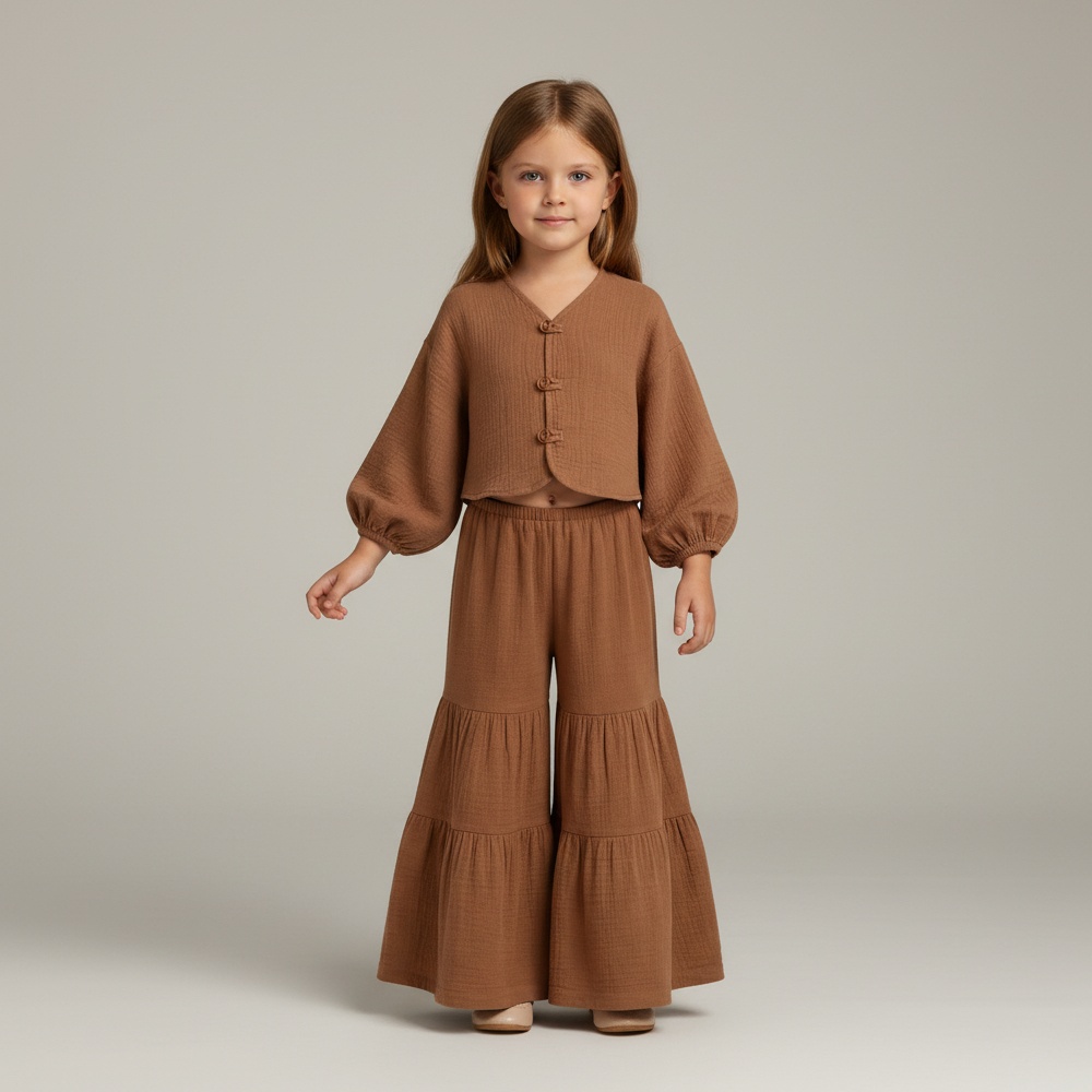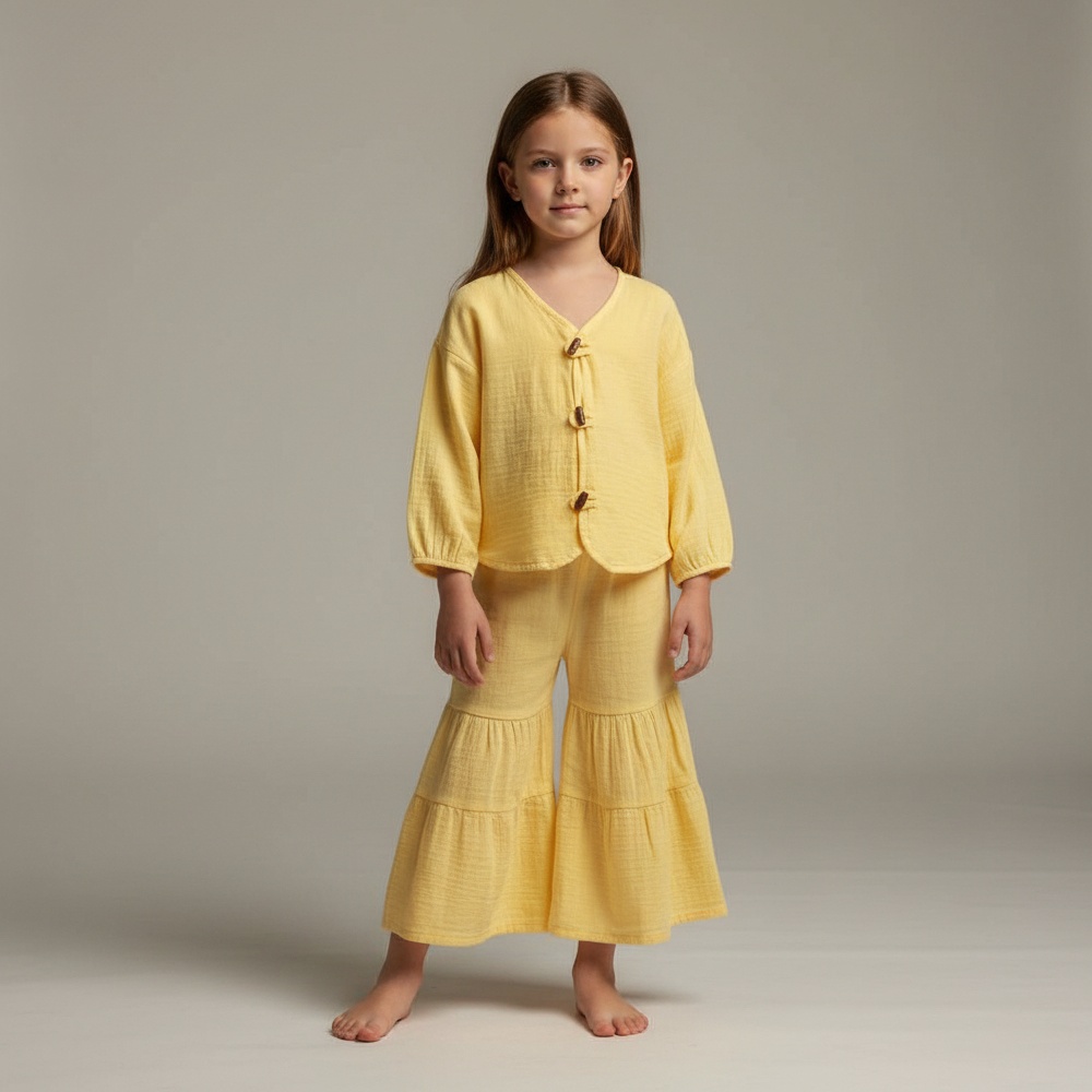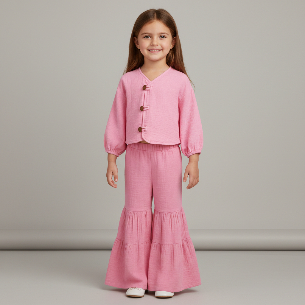 Kız Çocuk Balon Kollu İri Düğmeli Müslin Gömlek