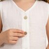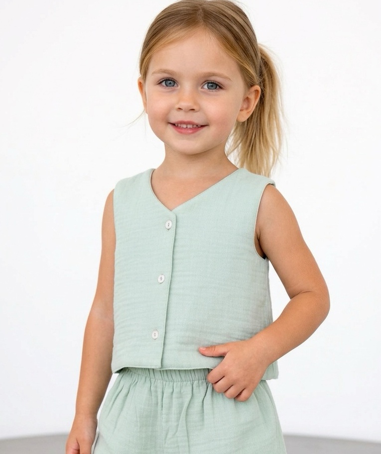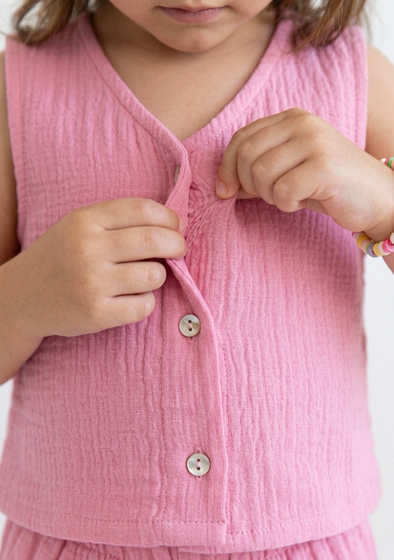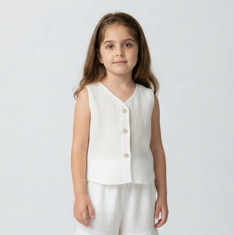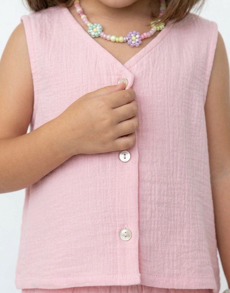 Ürün Açıklaması: Kız Çocuk Müslin Yelek; V Yaka, Düğmeli, Kolsuz, Astarsız