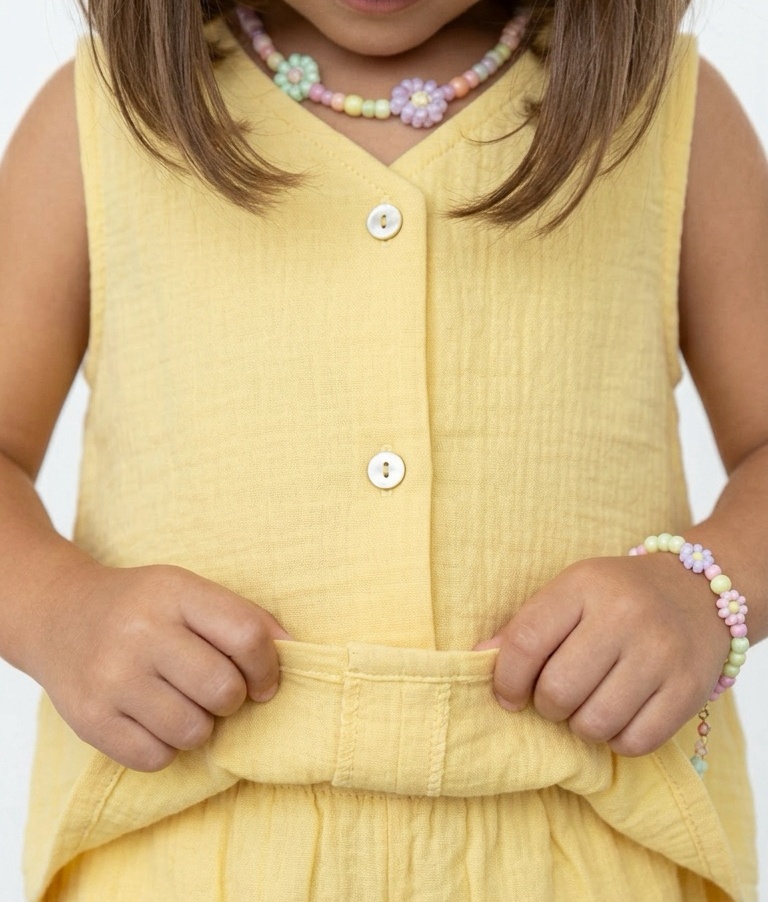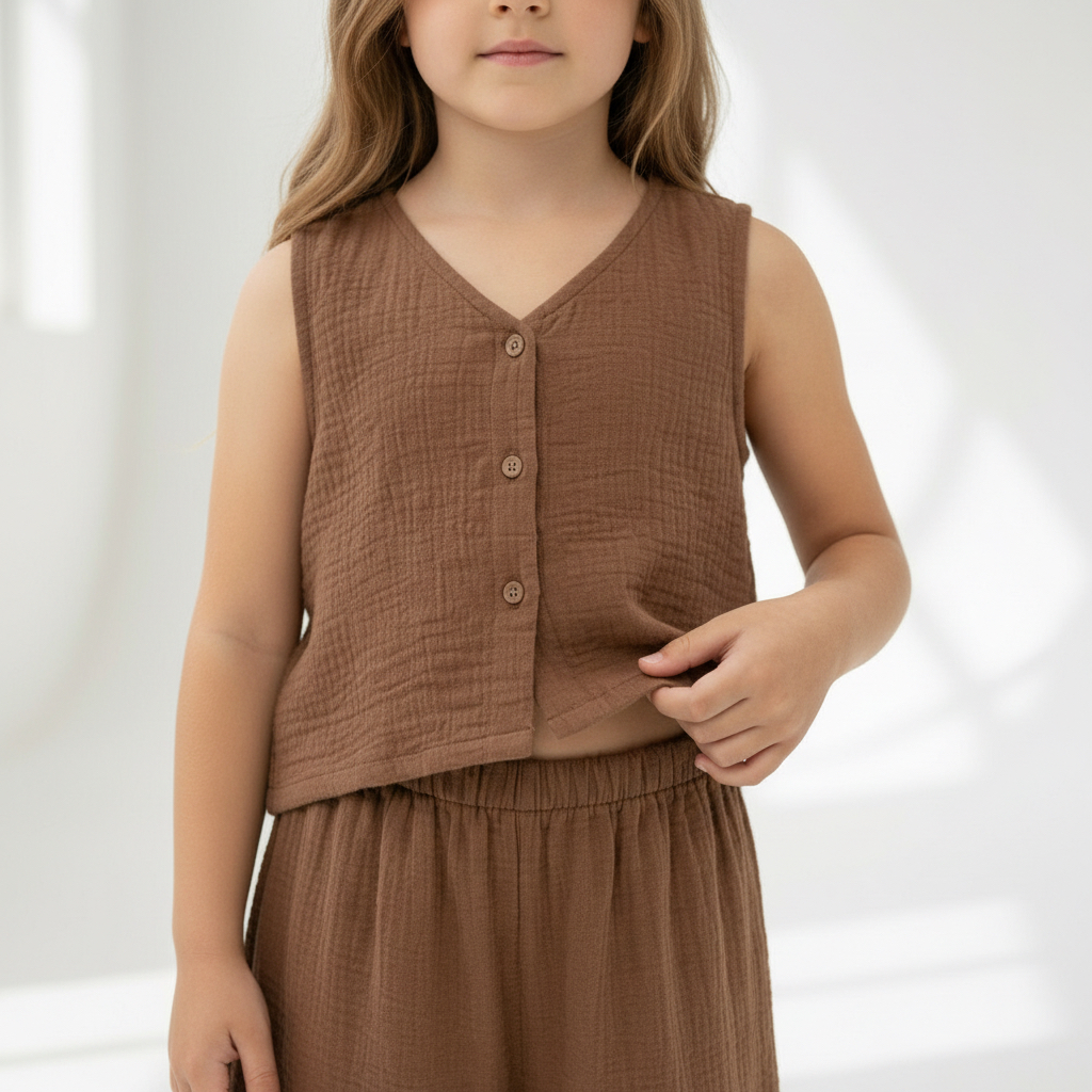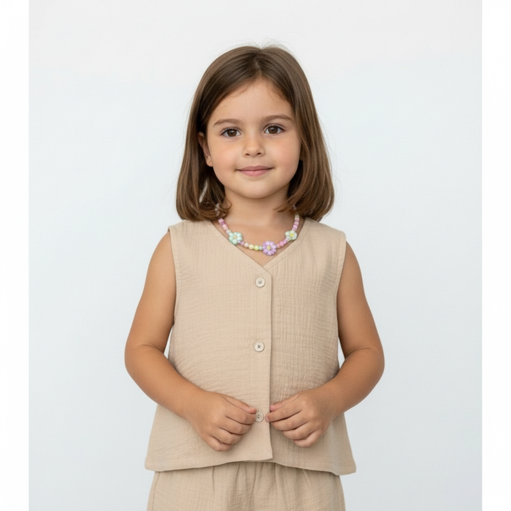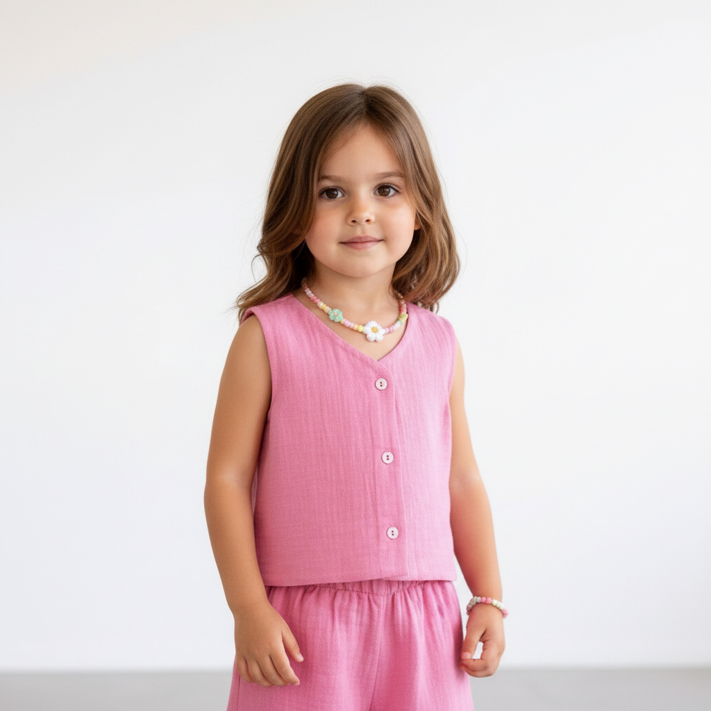 Ürün Açıklaması: Kız Çocuk Müslin Yelek; V Yaka, Düğmeli, Kolsuz, Astarsız